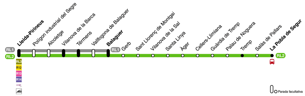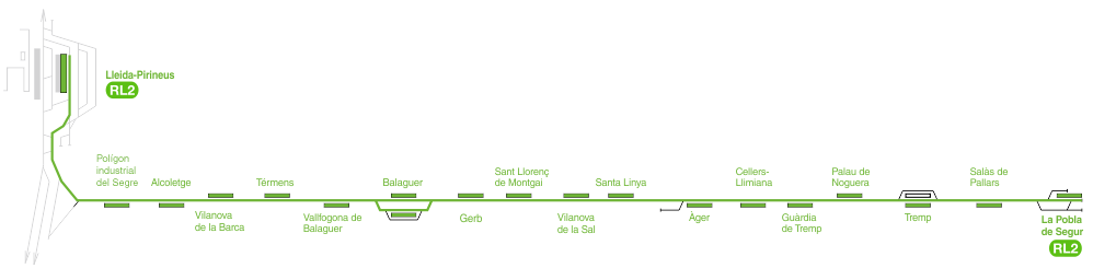 La línia RL2 de la línia Lleida-La Pobla dels FGC uneix Lleida-Pirineus i La Pobla de Segur . La línia té els seus orígens en el projecte d'unir Lleida amb Saint-Girons, a França, a través de port de Salau. El primer tram, de Lleida a Balaguer es va inaugurar l'any 1924, arribant a Cellers el 1949, a Tremp el 1950 i a La Pobla de Segur el 1951. El 1941 passava a formar part de RENFE i el 2005 es traspassava a Ferrocarrils de la Generalitat de Catalunya, tot i que hi continuarien operant trens de renfe fins el juliol de 2016, quan s’incorporen dos nous trens suïssos Stadler i un nou model de gestió a la línia. El 13 de gener de 2018 els serveis entre Lleida i La Pobla de Segur passen a denominar-se RL2.