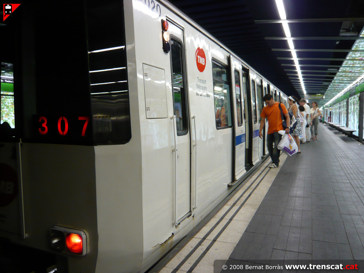 Unitat sèrie 3000 entrant a Liceu pel costat Drassanes (juliol 2008) |