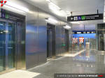 escalinata, un ascensor i una llarga escala mecànica (amb dos trams)