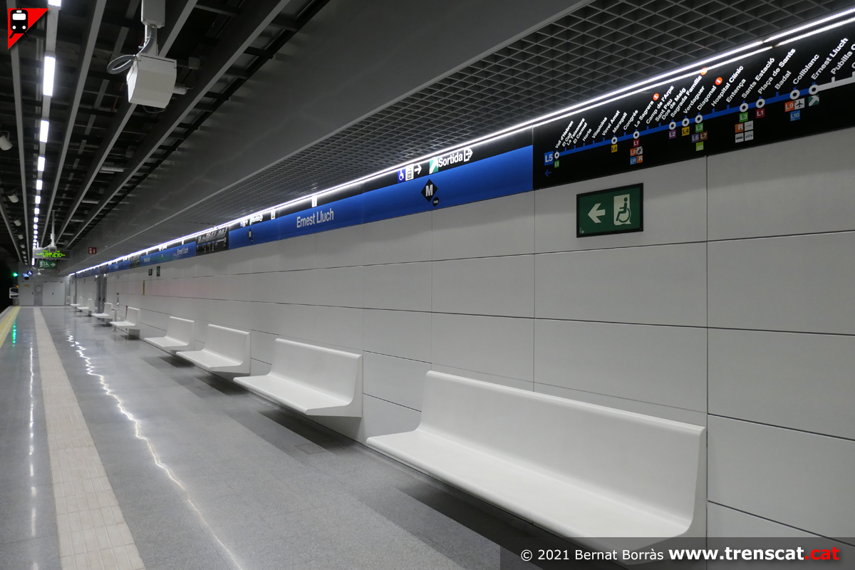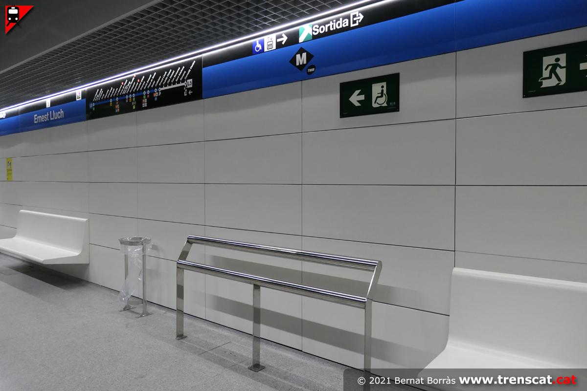 Detall dels bancs i senyalètica de l'estació Ernest Lluch de la L5