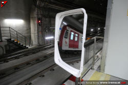 Cotxe 5053 vist pel mirall retrovisor de l'andana de la via 1