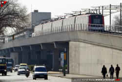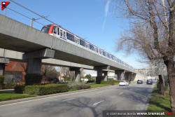 Unitat 9000 de TMB circulant pel viaducte entre les estacions de Foc i