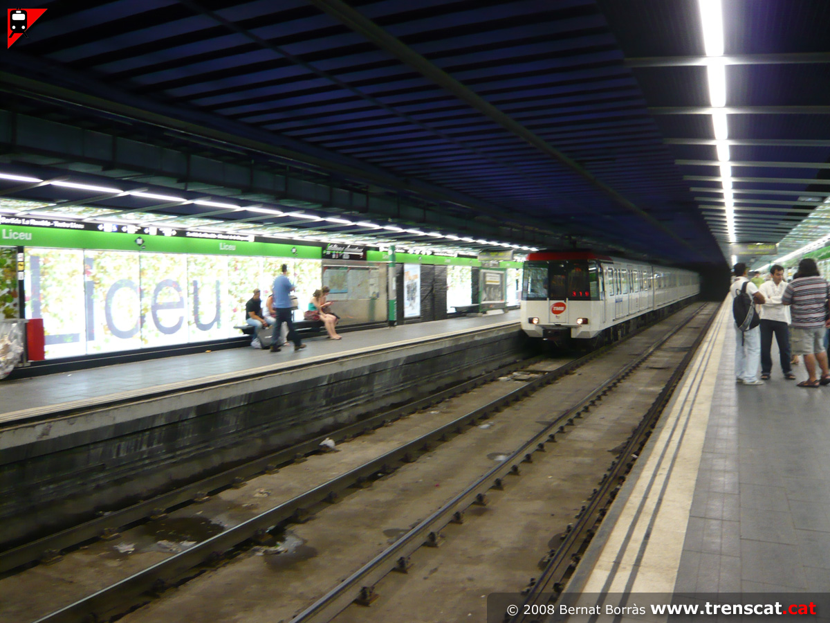 Unitat sèrie 3000 entrant a Liceu pel costat Drassanes (juliol 2008) |