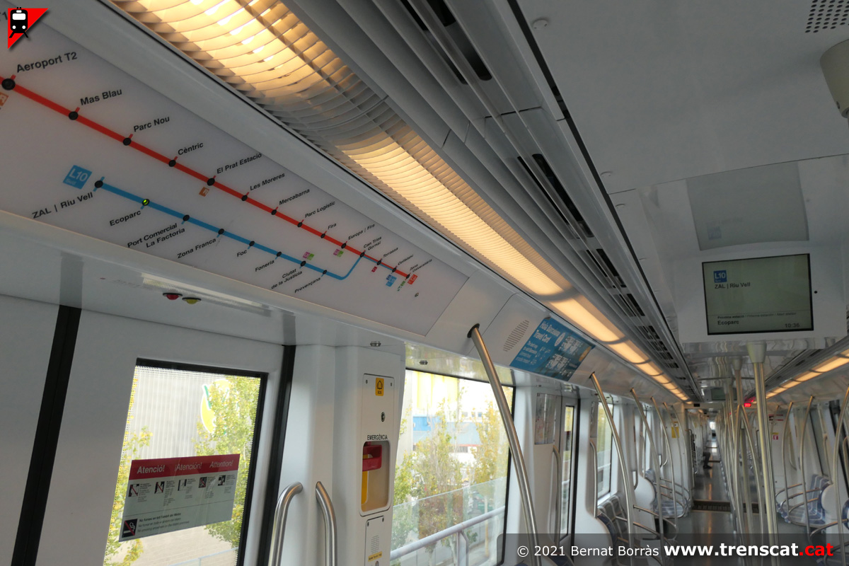 Interior d'un metro Alstom sèrie 9000 estacionat a Ecoparc (desembre 2021) |