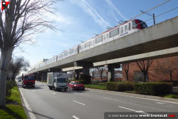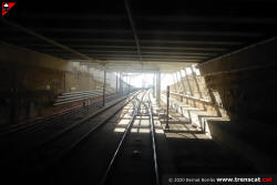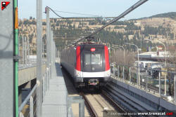 Unitat 9000 de TMB circulant pel viaducte entre les estacions de Foc i