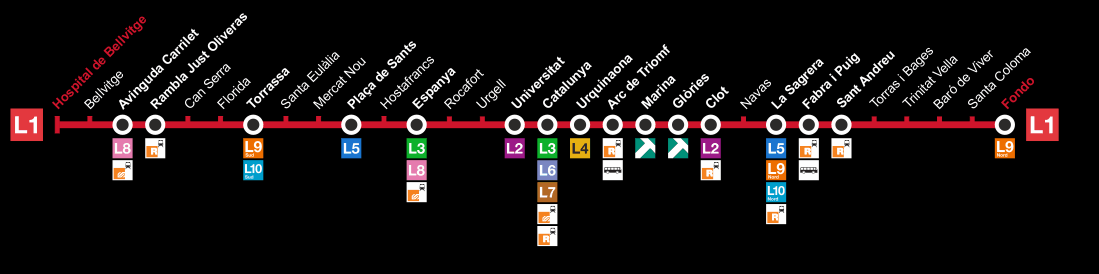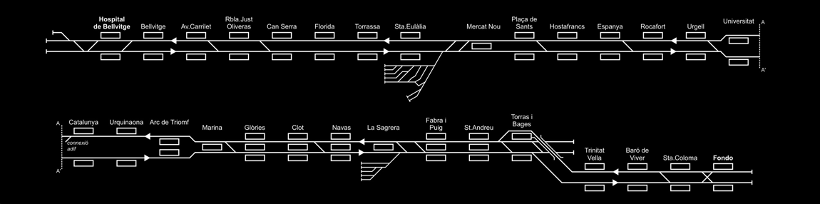 Bellvitge i Fondo. El traçat de la línia és en via doble soterrada excepte en