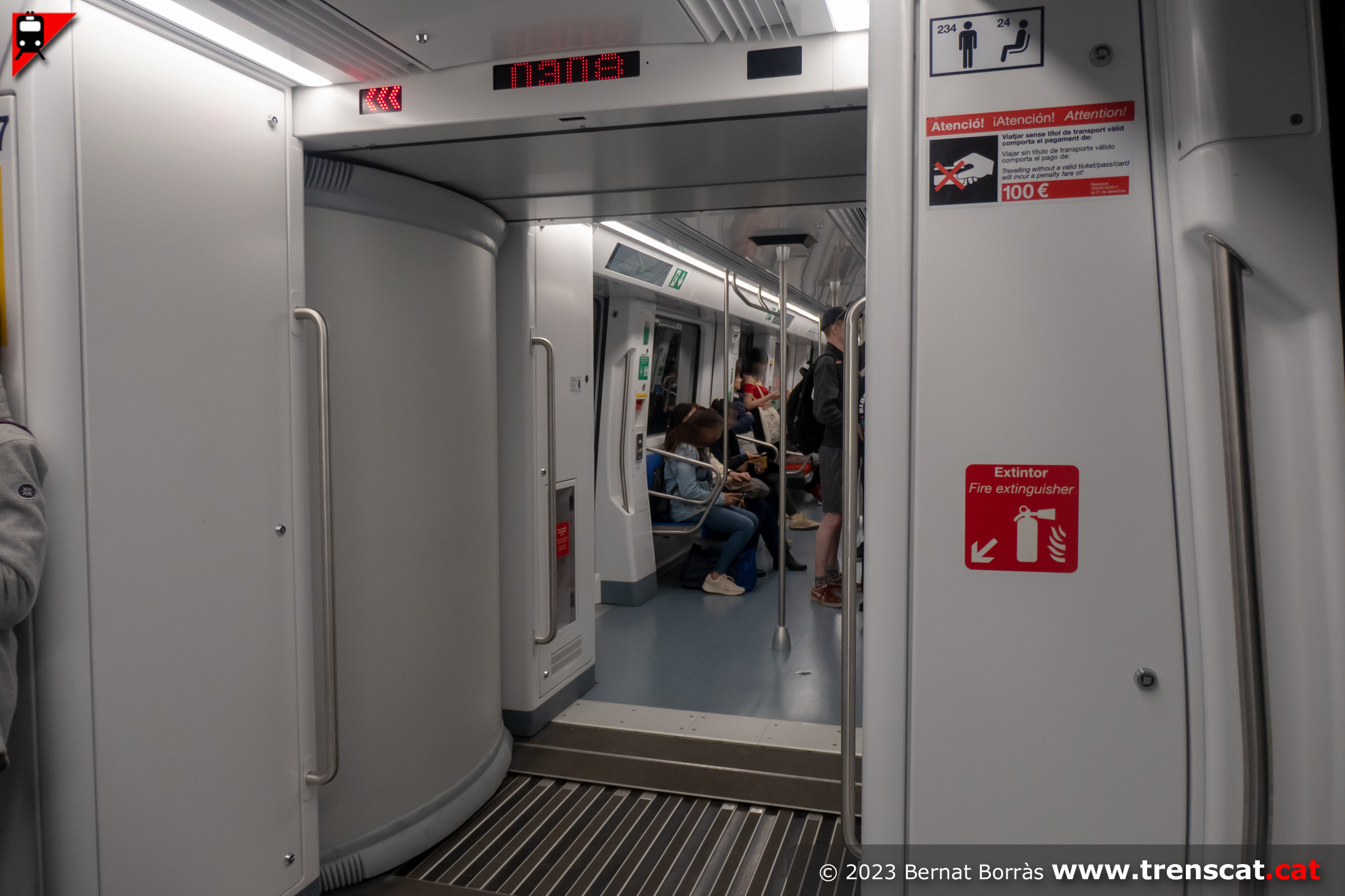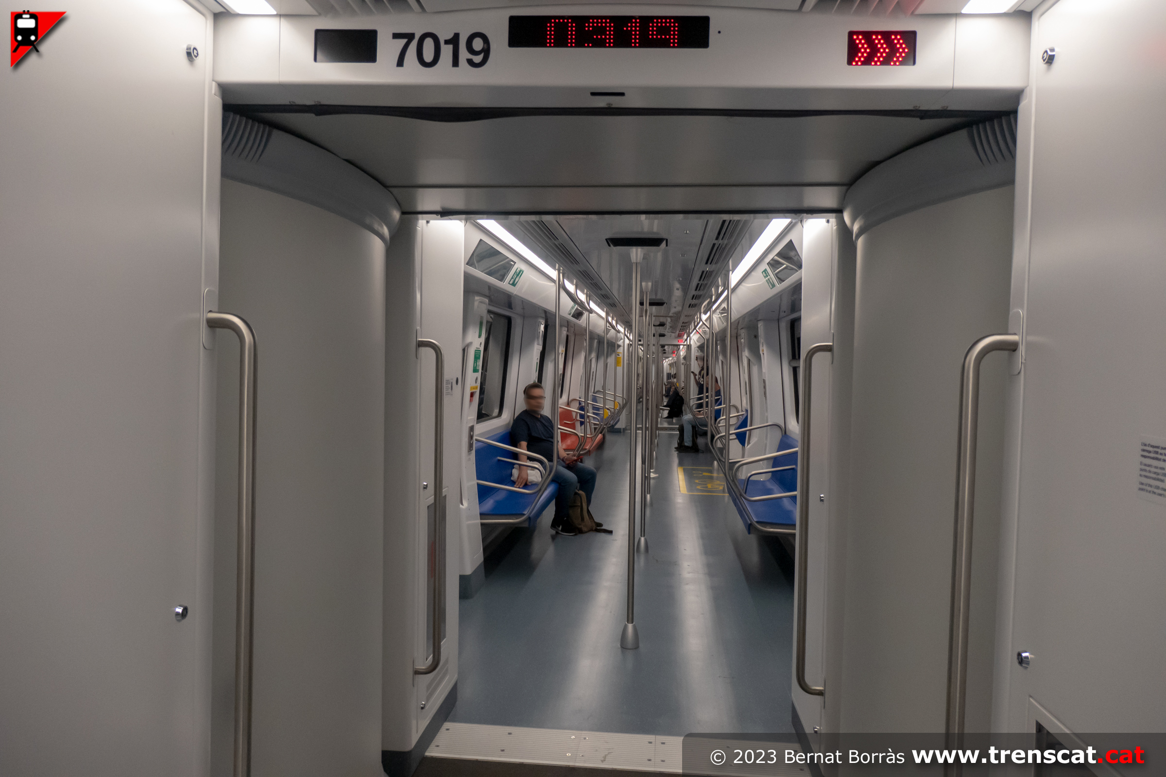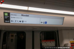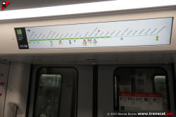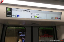 Pas entre els cotxes 7019 i 7505, amb el display amb el torn del tren en